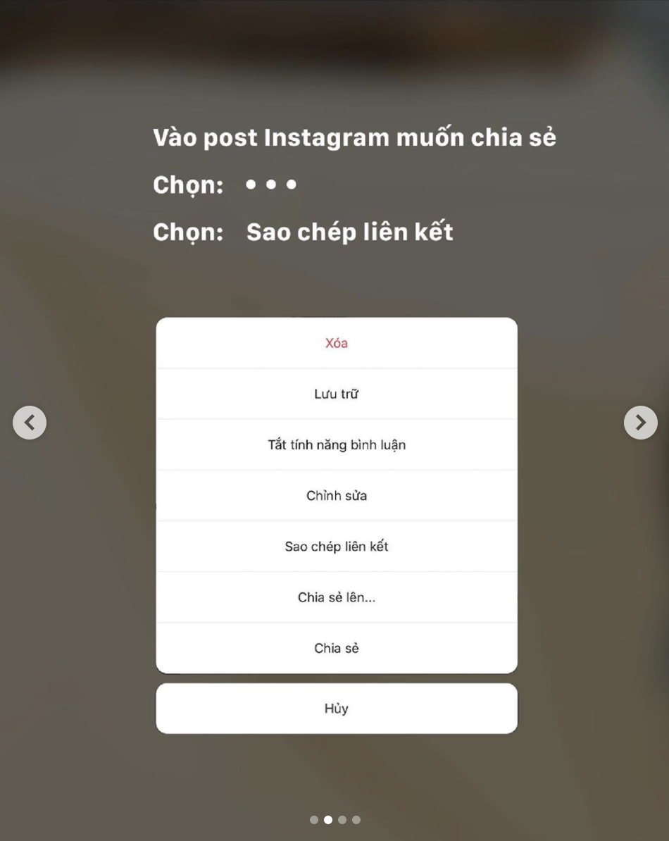 Bước 1: Vào trang Instagram của mình và chọn 1 ảnh bạn muốn chia sẻ, sau đó nhấn vào dấu 3 chấm trên bức hình và bấm “sao chép liên kết”. (Ảnh: tyxsomewhere)