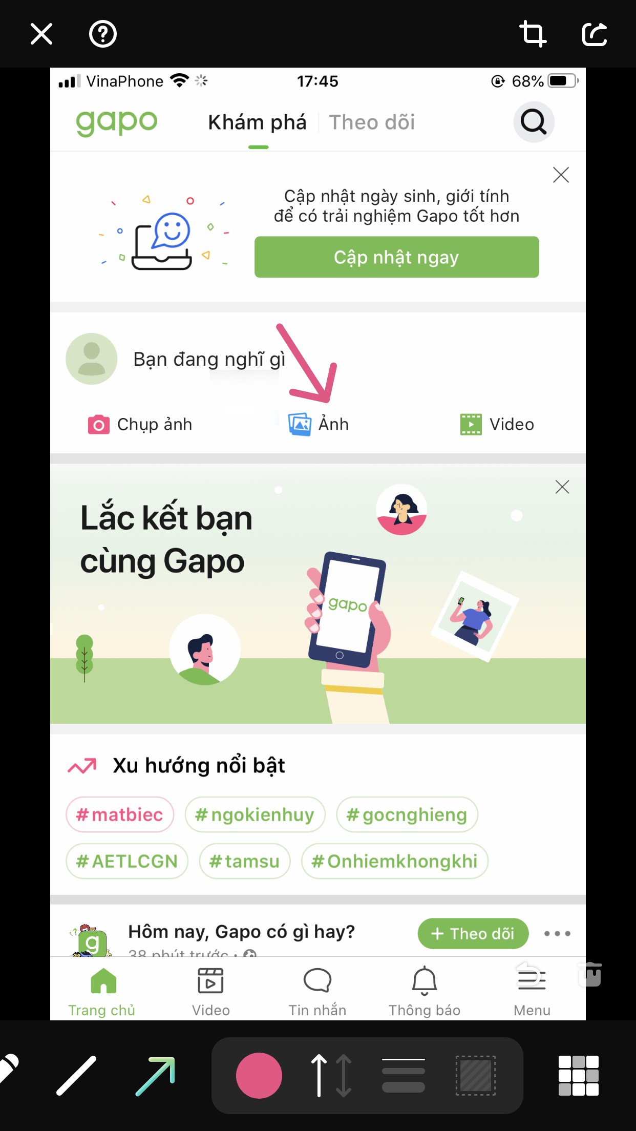 Bước 1: Sau khi vào ứng dụng Gapo trên điện thoại (hoặc vào trang chủ của Gapo trên trình duyệt), người dùng sẽ dễ dàng nhìn thấy mục “Bạn đang nghĩ gì” với các lựa chọn “Chụp ảnh”, “Ảnh” và “Video” hãy chọn “Ảnh”.