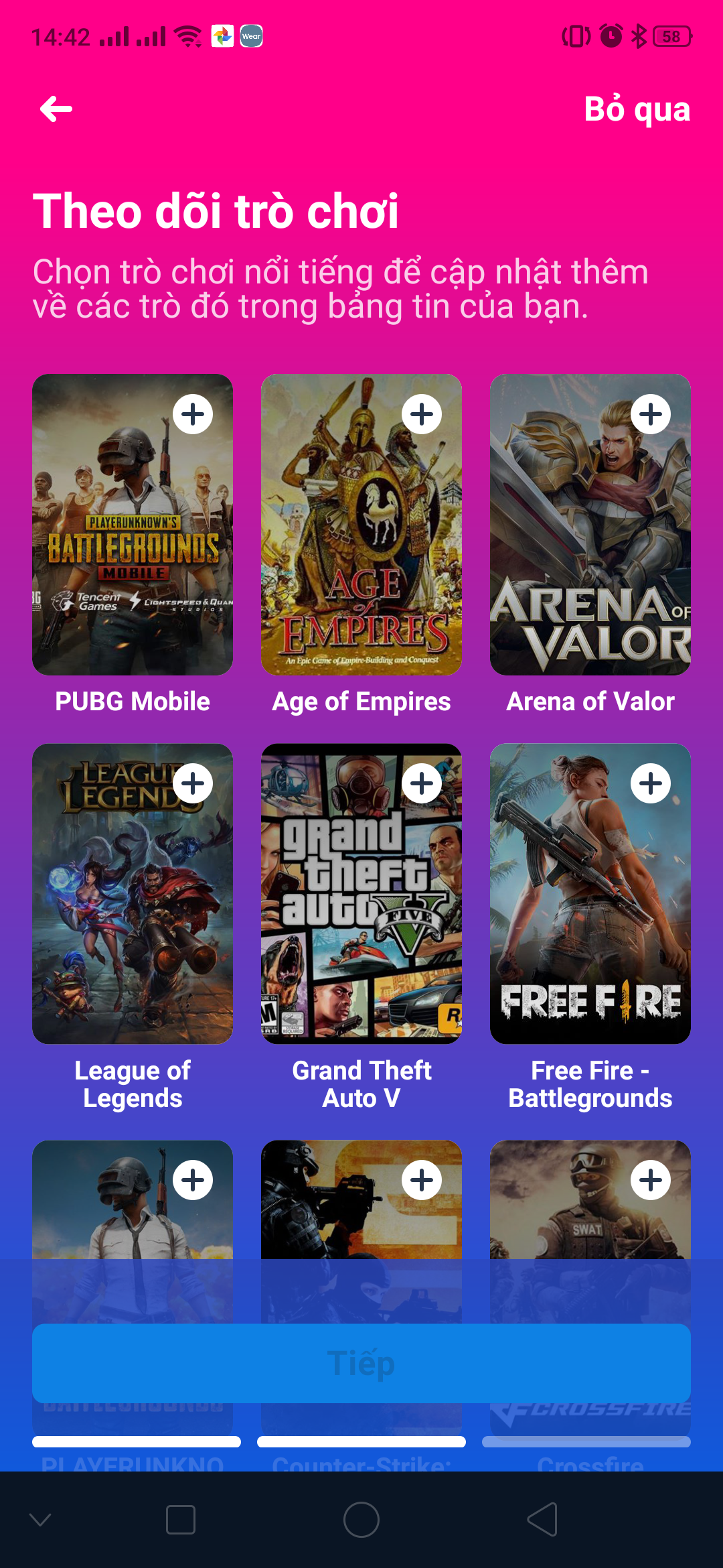 Bước tiếp theo mà bạn cần thực hiện là chọn tựa game mà mình thích theo dõi livestream. Trong danh sách này sẽ là những tựa game phổ biến có số lượng người chơi đông đảo nhất hiện nay. Bấm dấu cộng vào tựa game muốn theo dõi và nhấn Tiếp.