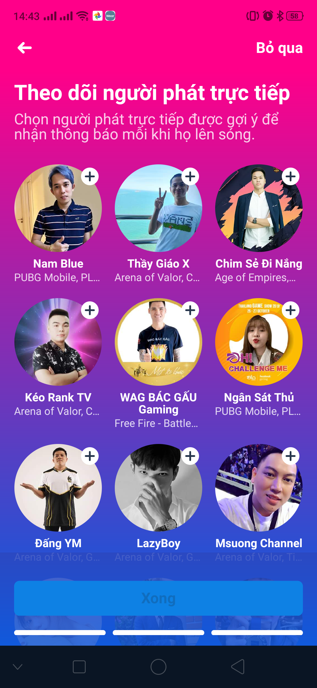 Facebook Gaming cũng sẽ gợi ý một loạt streamer được chú ý nhất hiện nay. Bạn sẽ chọn những streamer mình thích rồi nhấn Tiếp.