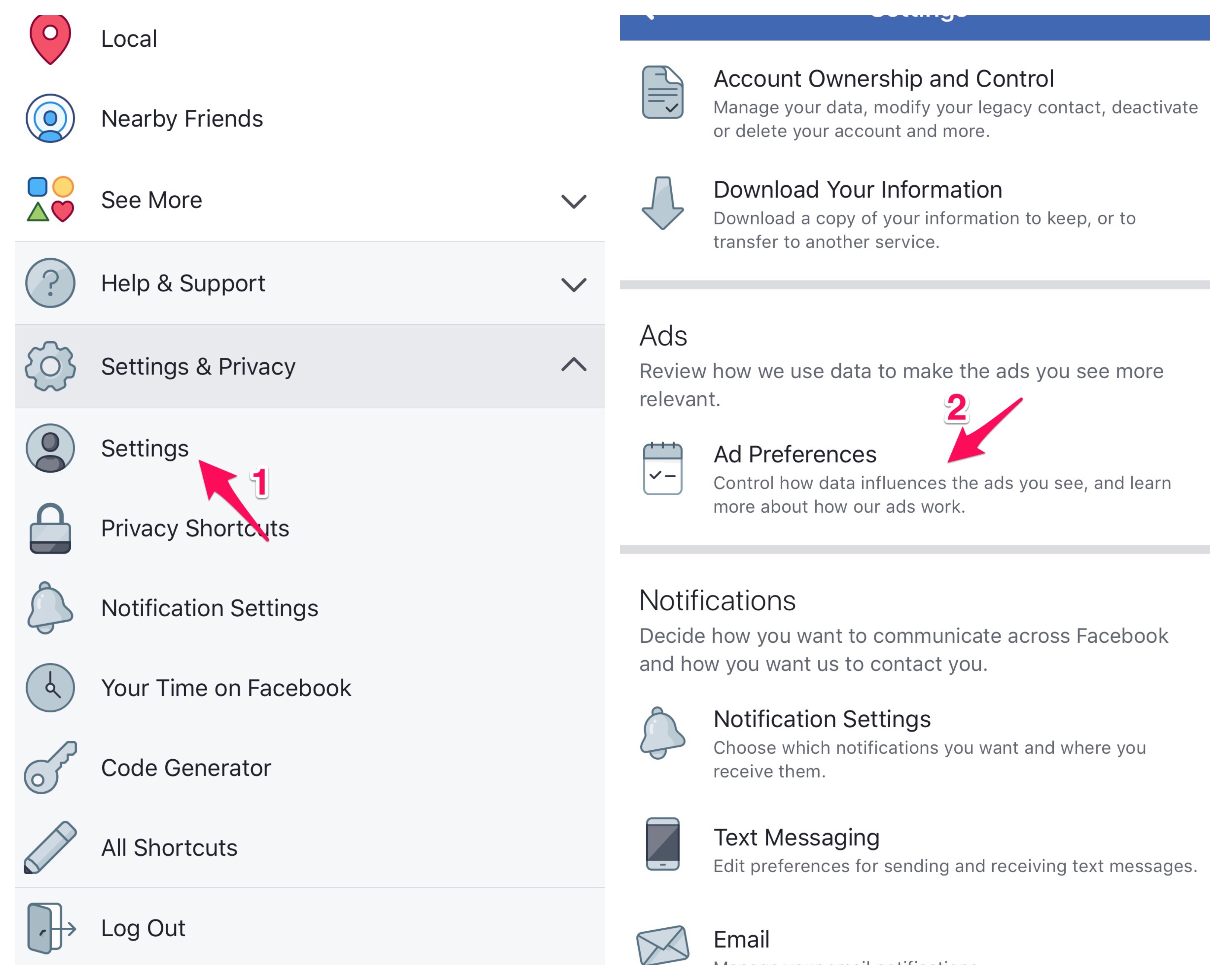 Đầu tiên bạn hãy truy cập vào ứng dụng Facebook trên smartphone. Sau đó chạm vào biểu tượng 3 vạch và chọn Settings & Privacy. Tiếp đến, cuộn xuống phần Ads và nhấp vào Ad Preferences.