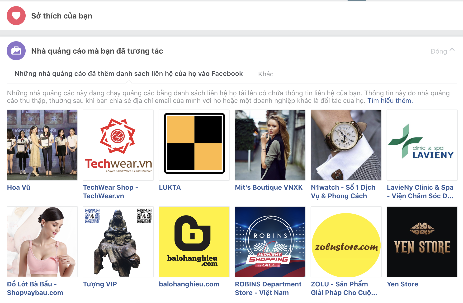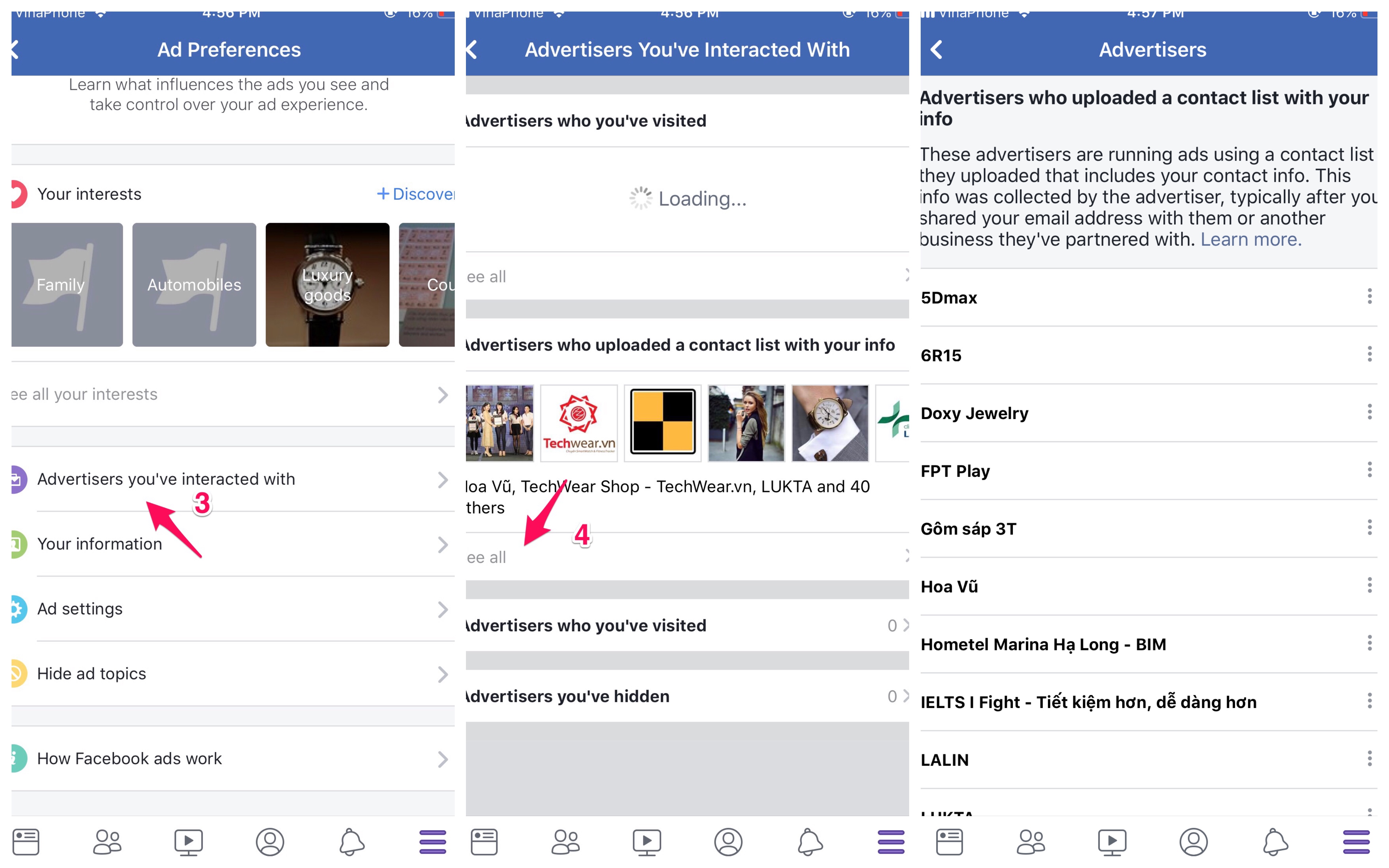 Tại đây chọn Advertisers you’ve interacted with, sau đó xem phần thứ hai với nội dung Advertisers who uploaded a contact list with your info. Nhấp vào nút See All để xem danh sách đầy đủ hơn.