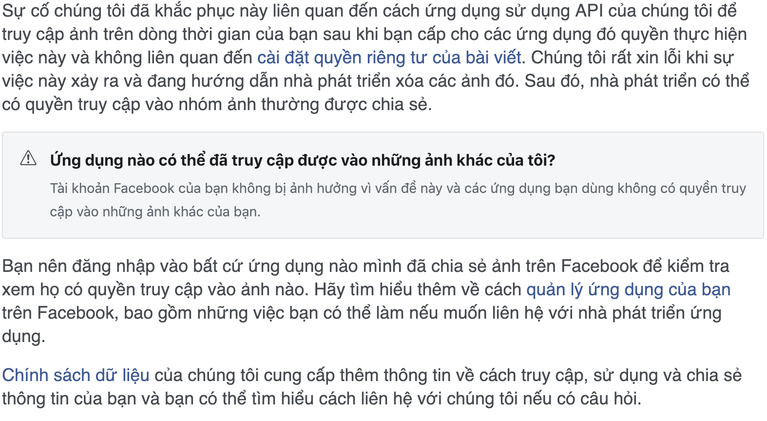 Đầu tiên, bạn hãy truy cập vào địa chỉ này. Sau đó, hãy kéo xuống cuối trang, nếu bạn thấy xuất hiện thông báo “Your Facebook account has not been affected by this issue and the apps you use did not have access to your other photos”, thì bạn có thể ngừng lo lắng vì tài khoản của bạn không bị ảnh hưởng trong vụ rò rỉ này.