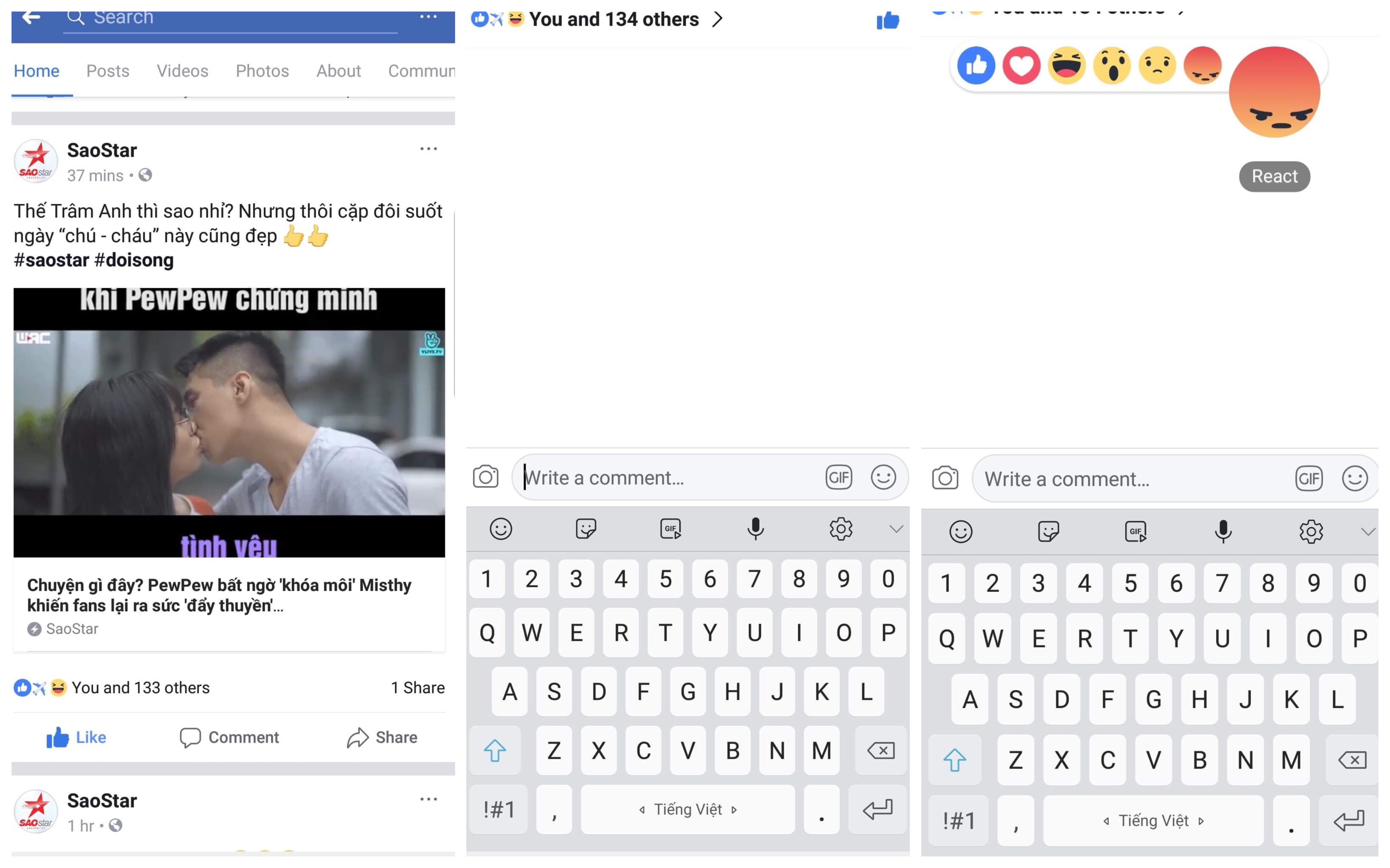 Bước 3: Tại góc trên bên phải màn hình ứng dụng, nơi có biểu tượng nút Like đã xanh (cho biết bạn đã thích bài viết này), bạn bấm giữ vào biểu tượng Like đó. Tại đây, bạn sẽ thấy một biểu tượng Angry (Phẫn nộ) thứ 2, bên cạnh biểu tượng cũ.