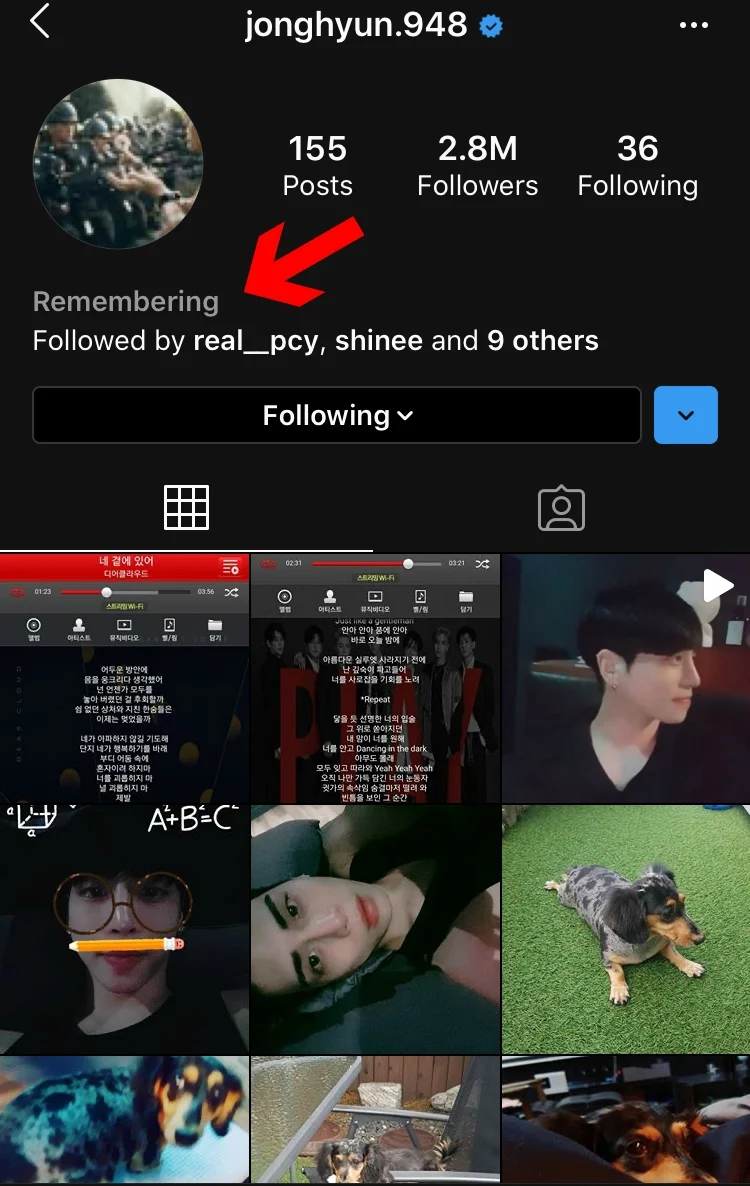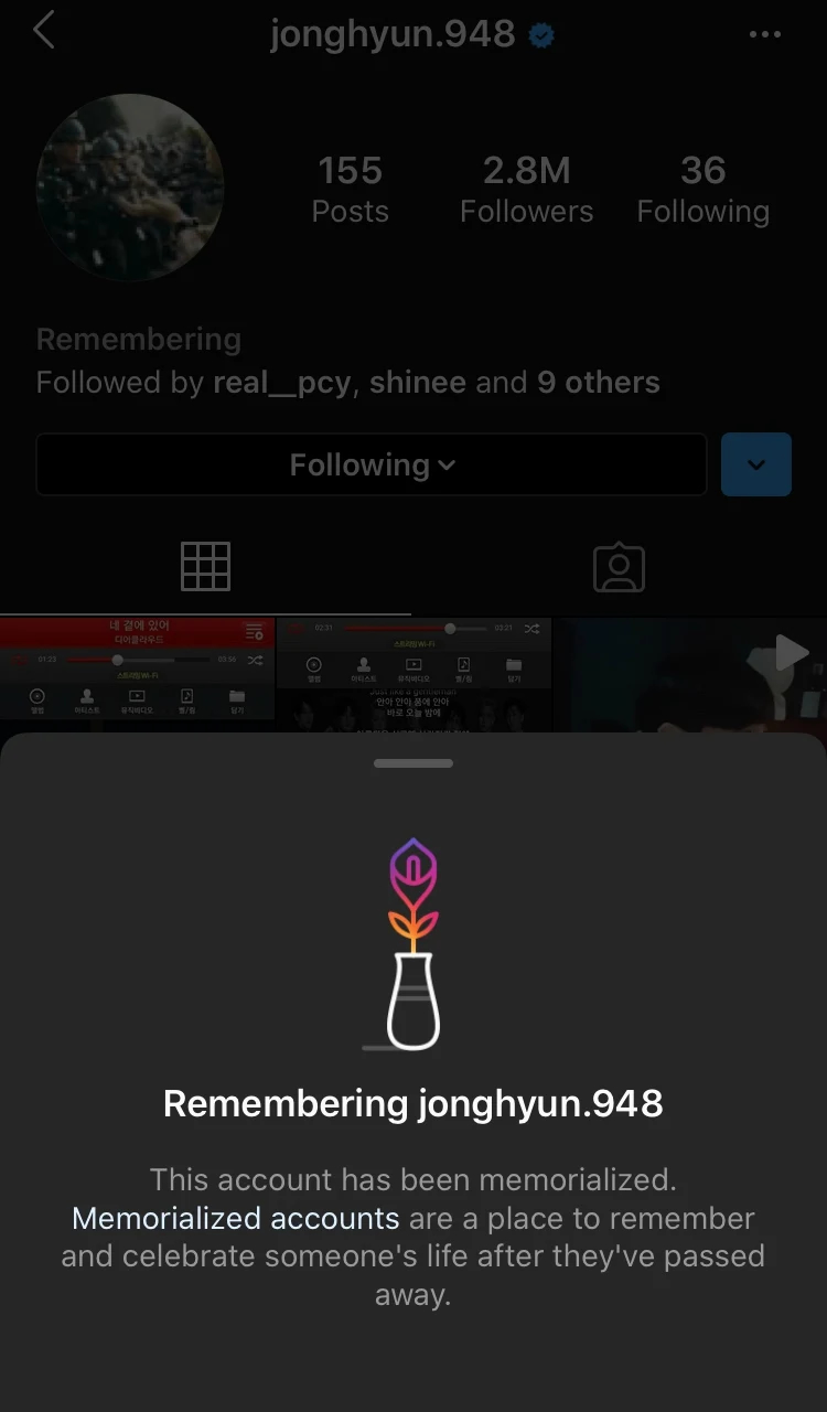 Theo phát hiện của các fan hâm mộ, tài khoản Instagram của Jonghyun đã hiển thị dòng chữ Remembering màu xám ở phía dưới ảnh đại diện. Khi nhấn dòng chữ Remembering này, Instagram sẽ hiển thị một thông báo cho biết đây là tài khoản thuộc về người đã khuất.