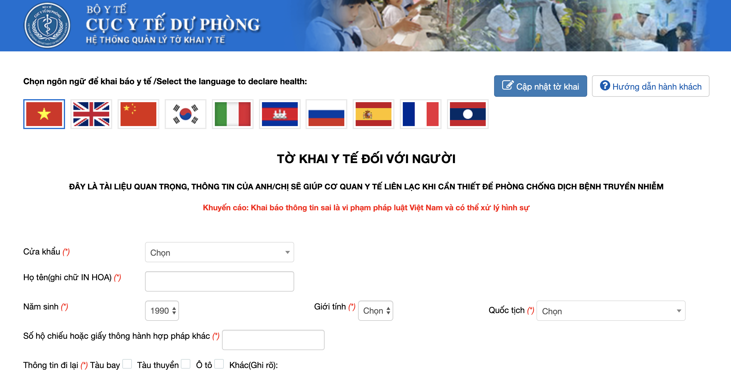 Lưu ý: Theo khuyến cáo trên Hệ thống thông tin quản lý tờ khai y tế của Bộ Y tế Cục Y tế dự phòng, hành động khai báo thông tin sai là vi phạm pháp luật Việt Nam và có thể bị xử lý hình sự.