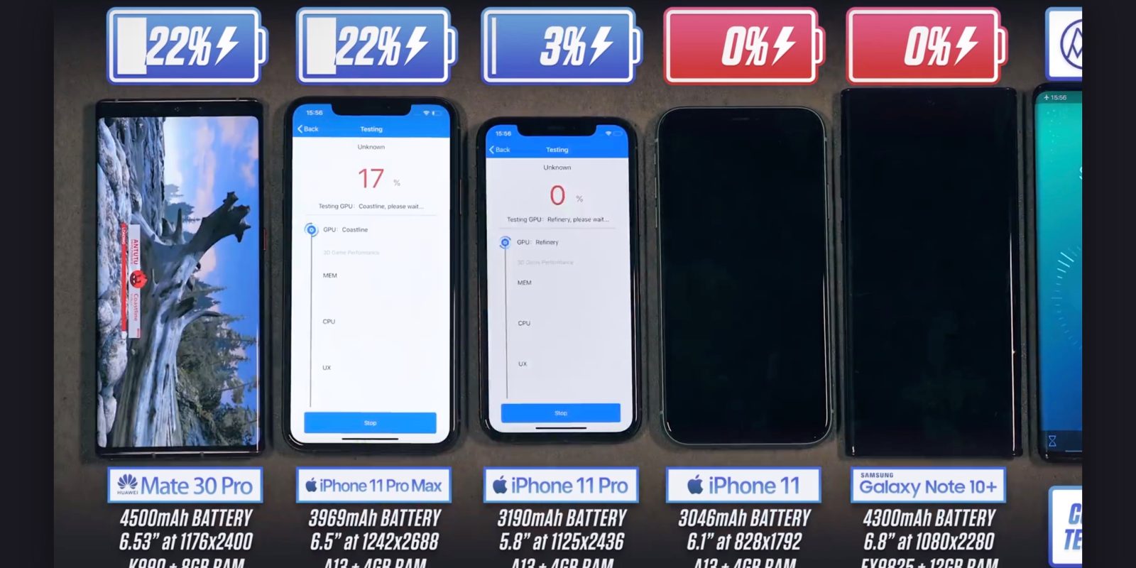 Trong tường hợp bạn chưa biết, iPhone 11 năm nay sở hữu viên pin 3.046 mAh, trong khi đó iPhone 11 Pro và iPhone 11 Pro Max có viên pin lớn hơn ở mức 3,190 mAh và 3.969 mAh. Trong thử nghiệm thời lượng sử dụng mới đây được vlogger công nghệ Arun Maini thực hiện, những chiếc điện thoại mới của Apple đã được mang ra đọ sức với Samsung Galaxy Note10+ với pin 4.300 mAh và Huawei Mate 30 Pro với pin 4,500 mAh.