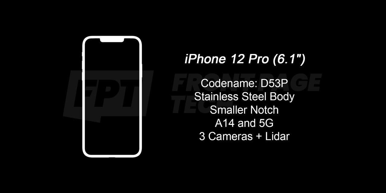 iPhone 12 Plus (6.1 inch) sẽ có 2 camera, khung viền bằng nhôm, “tai thỏ” được thu nhỏ, chipset A14 hỗ trợ 5G. (Ảnh: Front Page Tech)