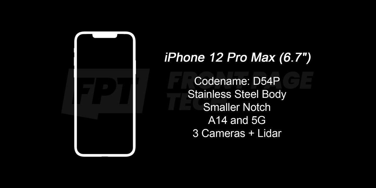 iPhone 12 Pro Max (6.7 inch) sẽ có 4 camera, khung viền bằng thép không rỉ, “tai thỏ” được thu nhỏ, chipset A14 hỗ trợ 5G. (Ảnh: Front Page Tech)