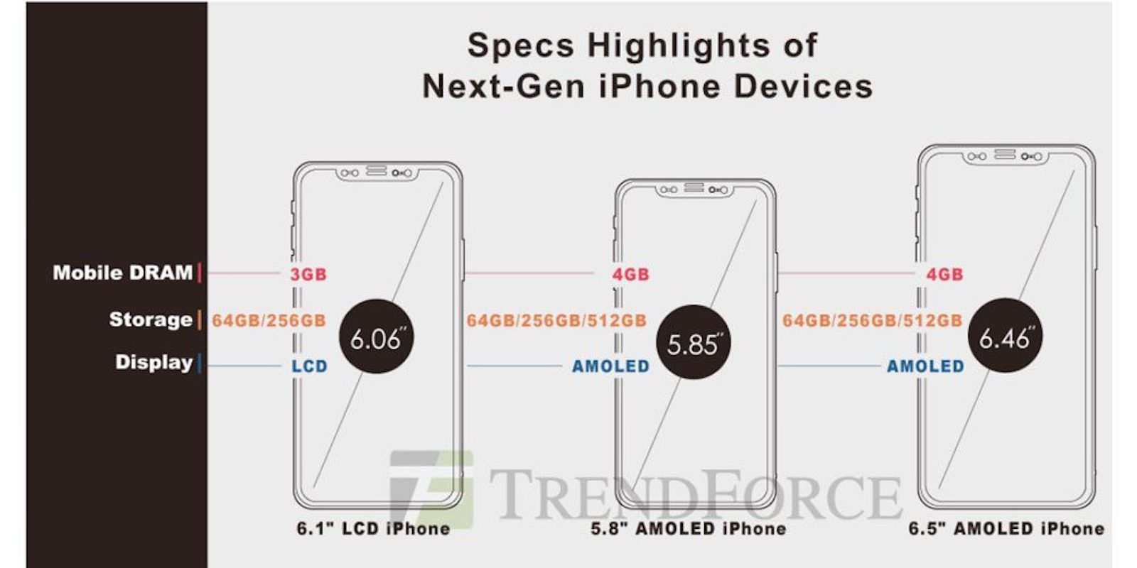 Ngoài ra, theo báo cáo từ TrendForce, dòng iPhone OLED 2018 sẽ có đến 3 tùy chọn bộ nhớ, thay vì chỉ 2 như trên iPhone X, cụ thể là 64GB, 256GB và 512GB, cùng 4GB RAM.