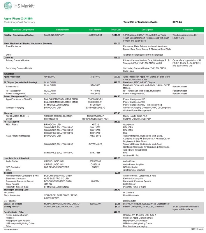 Theo báo cáo ước tính rằng để trang bị màn hình OLED 5,8-inch, Apple phải chi trả khoảng 65,50 USD cộng thêm cảm biến cường lực Force Touch đã ngốn không dưới 100 USD, gần gấp đôi so với màn hình LCD 36 USD của iPhone 8.