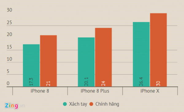Giống với iPhone X, mức chênh của iPhone 8, 8 Plus xách tay so với chính hãng khoảng 3,5 đến gần 4 triệu đồng.
