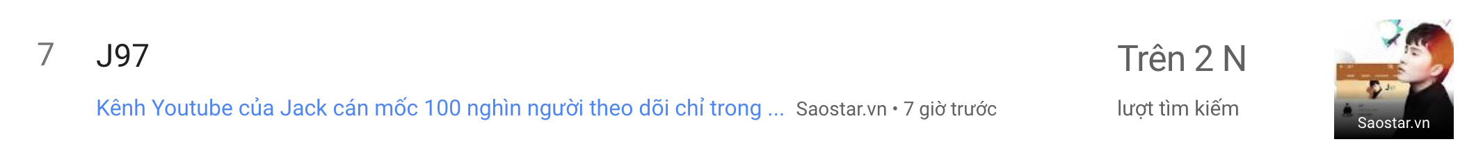 Trong khi đó, Jack với nghệ danh mới J97 cũng lọt top 7 Google Trend tại khu vực Việt Nam. Vào thời điểm tối qua, Jack đã tung ra loạt ảnh với tạo hình mới mẻ cùng kênh YouTube riêng mang tên “J97”. Chỉ sau nửa ngày, kênh YouTube riêng của anh đã nhận về hơn 238.000 nghìn lượt theo dõi. Điều này đồng nghĩa với việc, chỉ chưa đầy 1 ngày ra mắt, Jack đã chính thức sở hữu nút Bạc YouTube chỉ với 1 video có nội dung thông báo chính thức về sự trở lại.