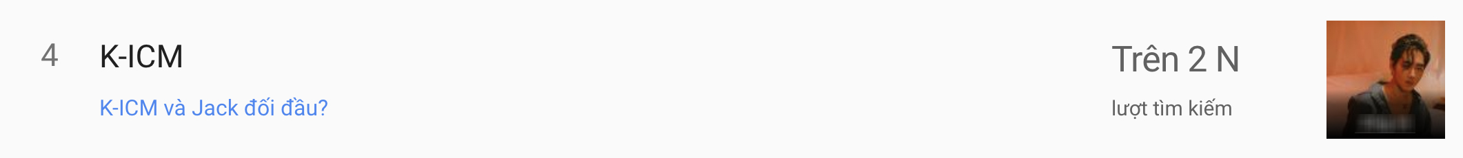Dù không còn song hành với nhau trong các sản phẩm âm nhạc, thế nhưng sức hút Jack và K-ICM vẫn không hề suy giảm. Minh chứng là cả Jack và K-ICM đều nhanh chóng lọt top tìm kiếm Google Việt Nam. Do Google là công cụ tìm kiếm được sử dụng phổ biến nhất hiện nay tại Việt Nam, nên việc Jack và K-ICM lọt top xu hướng tìm kiếm của Google cũng phần nào cho thấy sức hút mạnh mẽ của 2 hiện tượng âm nhạc ấn tượng nhất 2019.