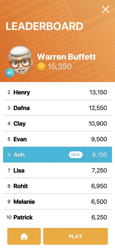 Trò chơi này có một bảng xếp hạng điểm số với người dẫn đầu là Warren Buffett. Có lẽ đây là một mục tiêu khó bị đánh bại.