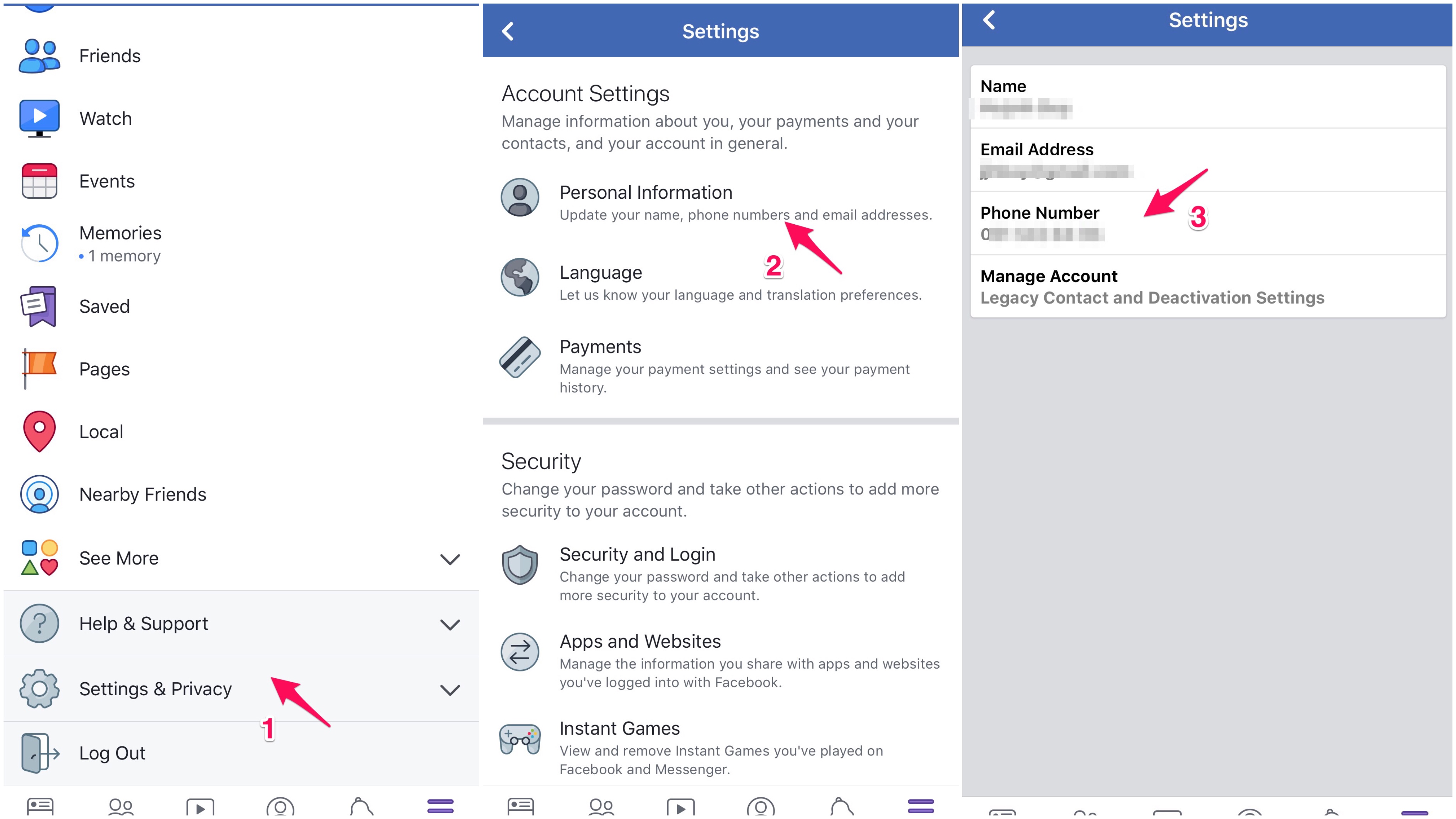Đầu tiên, bạn hãy truy cập ứng dụng Facebook trên điện thoại. Sau ấn vào tuỳ chon Settings & Privacy. Tiếp đến, chọn Settings > Personal Information, tại đây bạn sẽ thấy tên, địa chỉ email và số điện thoại mà mình đã cung cấp cho ứng dụng.