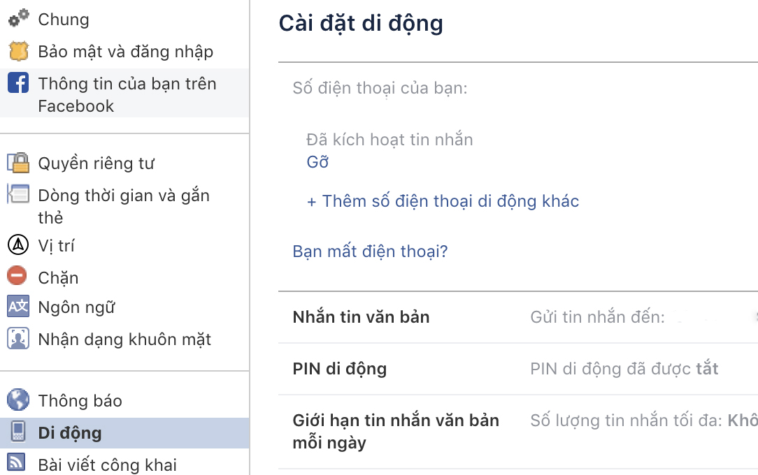 Để xóa số điện thoại khỏi Facebook trên trình duyệt máy tính, đầu tiên bạn hãy chuyển đến phần Cài đặt. Sau đó, bạn hãy truy cập tuỳ chọn “Di động“, tại đây bạn sẽ thấy số điện thoại di động mà mình đã cung cấp cho Facebook. Nhấn “Gỡ” và điền thông tin mật khẩu để hoàn thành.