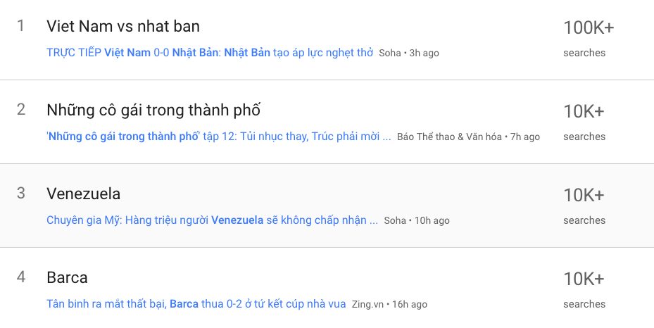 Tối ngày 24/01, chủ đề tìm kiếm được thực hiện nhiều nhất trên trang tìm kiếm Google tại Việt Nam là “Viet Nam vs Nhat Ban”. Theo đó, trang theo dõi xu hướng tìm kiếm Google Trends ghi nhận lưu lượng tìm kiếm từ khoá này lên tới trên 100.000 lượt chỉ trong một thời gian ngắn. Trận cầu giữa đội tuyển Việt Nam và đội tuyển Nhật Bản trong khuôn khổ vòng tứ kết Asian Cup 2019 vượt qua tất cả mọi chủ đề khác để trở thành điều được nhiều người quan tâm nhất.