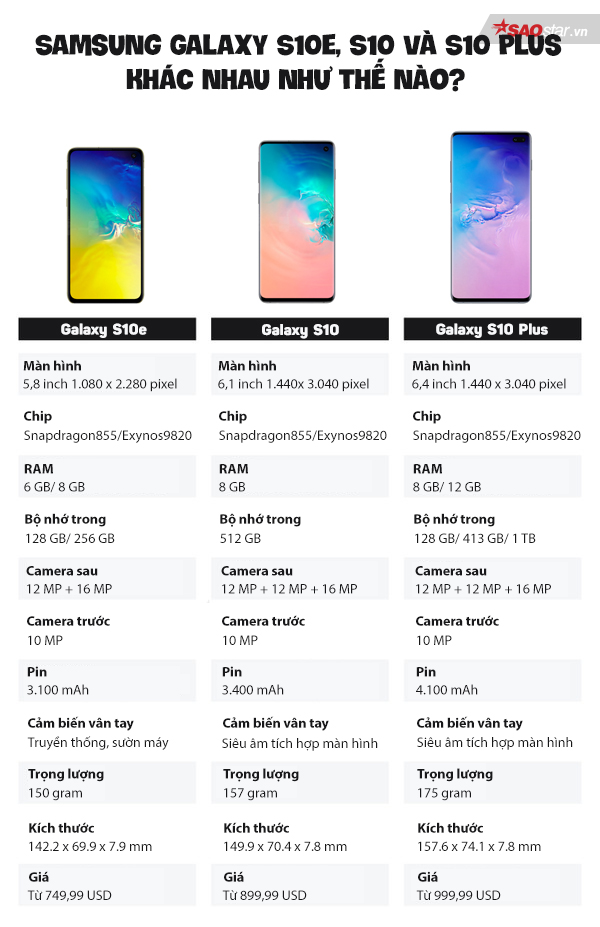 Samsung Galaxy S10e được trang bị màn hình 5,8 inch với camera kép ở mặt lưng với khá nhiều đặc điểm tương đồng với bộ đôi S10 và S10 Plus. Trong khi đó, S10 5G có tới bốn camea sau cùng màn hình kích thước 6,7 inch. Máy cũng được trang bị viên pin ấn tượng lên tới dung lượng 4.500 mAh. Theo thông tin ban đầu, một số đối tác khác sẽ hỗ trợ S10 5G trong thời gian tới bao gốm nhà mạng Sprint (Pháp), T-Mobile (Đức) và Vodafone (Anh).