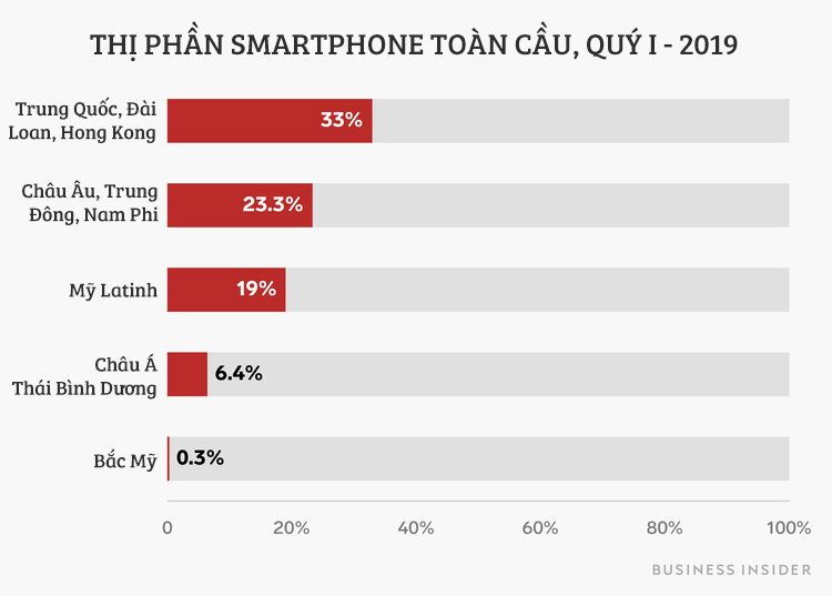 Với diễn biến này, vị thế của Huawei trong làng di động có thể sẽ lung lay dữ dội. Mặc dù điện thoại Huawei khá khó mua ở Mỹ, Huawei hiện đang là nhà sản xuất smartphone lớn thứ hai trên thế giới, chỉ đứng sau Samsung. Thị phần lớn nhất của Huawei hiện nằm ở quê nhà Trung Quốc nơi hãng này chiếm tới 32,95% trong tổng lượng smartphone bán ra trong quý I năm 2019, dẫn nguồn dữ liệu từ công ty nghiên cứu thị trường Canalys. Huawei bên cạnh đó cũng có thị phần ấn tượng tại Châu Âu, Trung Đông và Châu Phi.