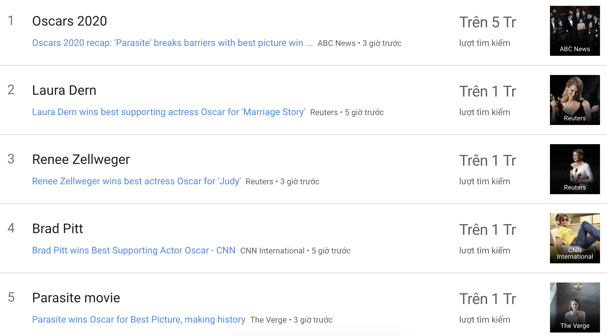 Bên cạnh đó, các từ khoá về lễ trao giải Oscar 2020 cũng được tìm kiếm nhiều nhất dịp này trên công cụ tìm kiếm của Google.