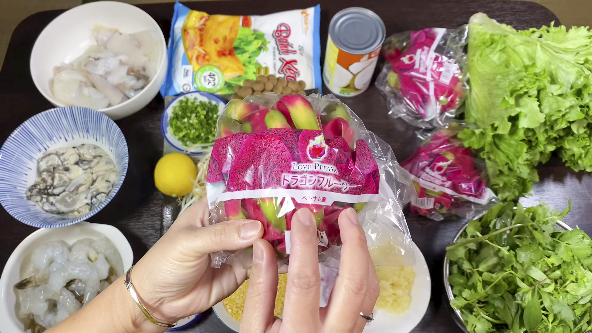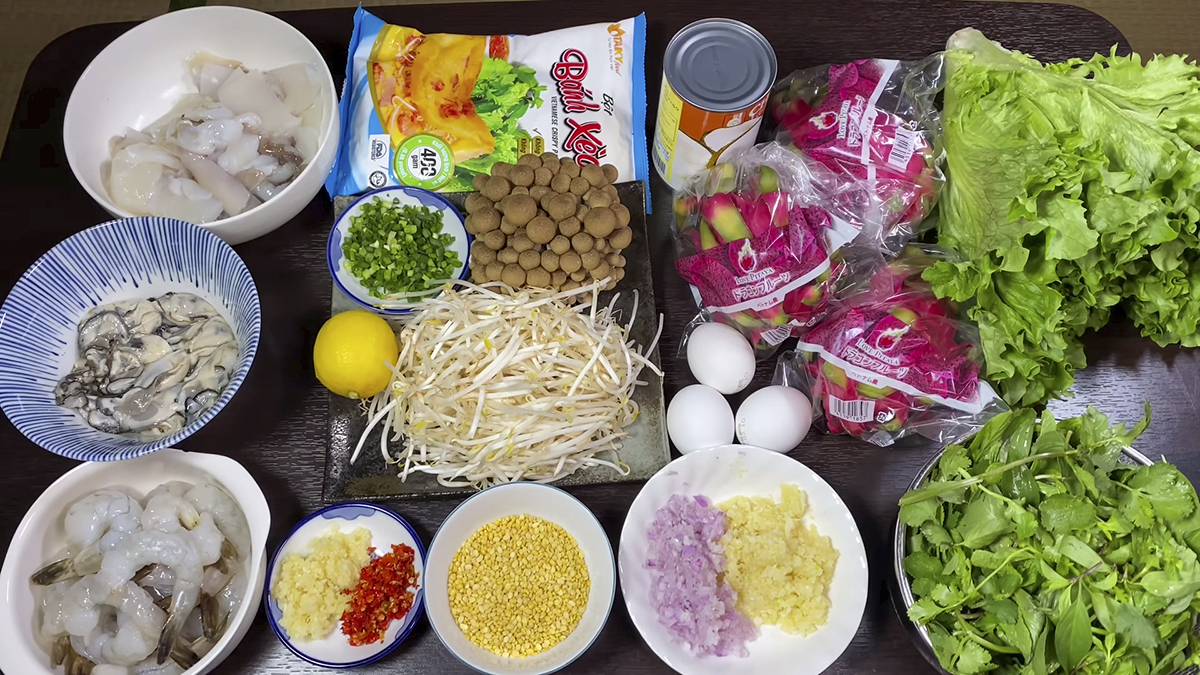 Món bánh xèo thanh long của Quỳnh Trần có các nguyên liệu cơ bản như bột đổ bánh xèo mua sẵn, đỗ xanh, trứng gà, tôm, mực, hàu, giá đỗ,… kèm theo đó là 3 quả thanh long đỏ được nhập từ Việt Nam với giá 60.000 đồng/quả.