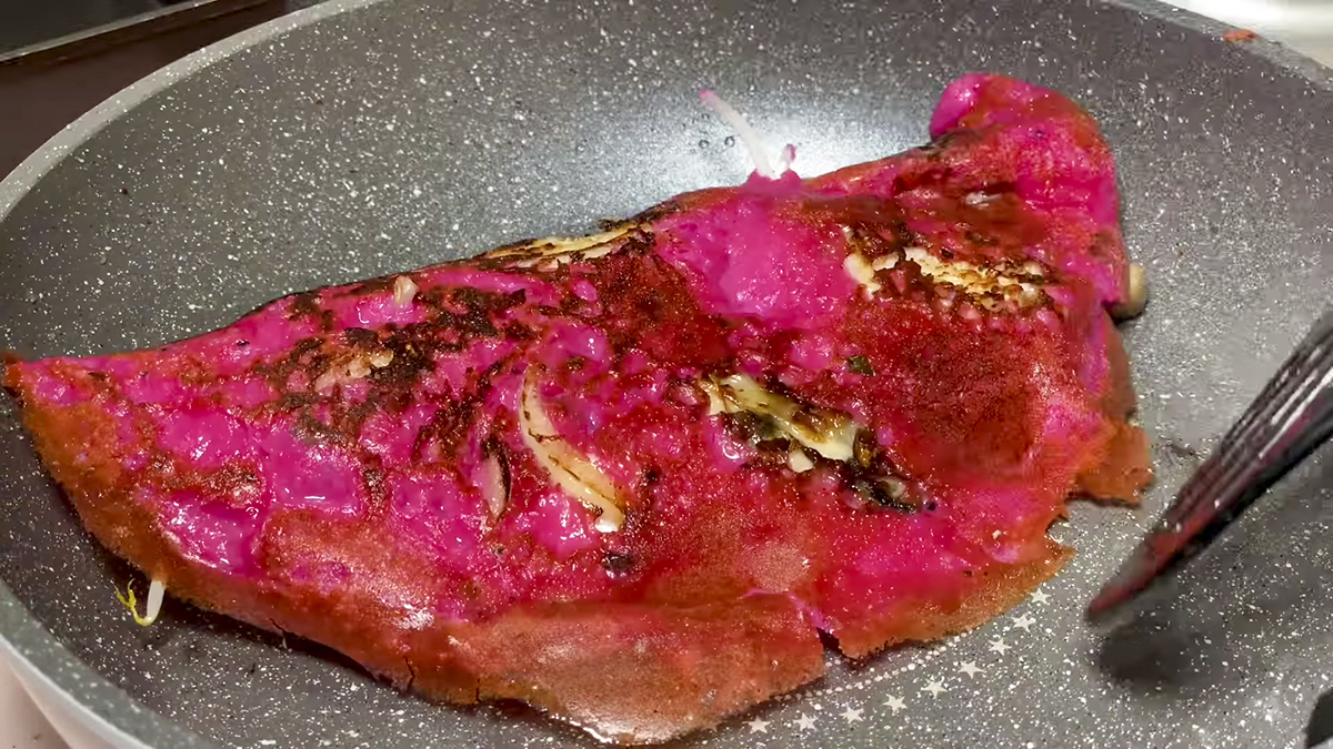 Thành quả là một chiếc bánh xèo thanh long màu hồng đẹp mắt