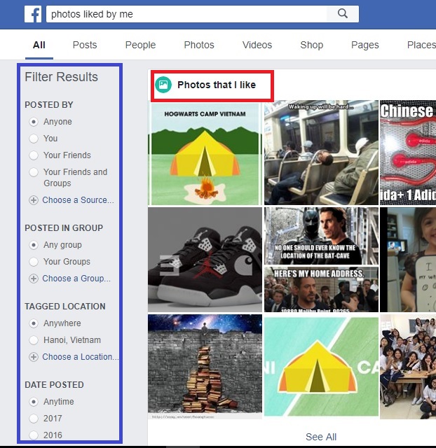 Những nội dung tìm kiếm ra còn có thể được lọc theo thời gian, địa điểm đăng tải, do vậy đây có thể là một trải nghiệm khó quên khi nhìn lại mọi hình ảnh mình từng cảm thấy thích thú và like từ hồi đàu dùng Facebook. Nhưng nếu đối tượng tìm kiếm là người khác thì không ai dám chắc bạn sẽ cảm thấy như thế nào khi xem xong những hình ảnh họ like đâu nhé.
