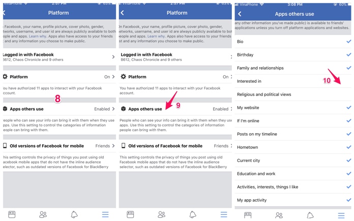 Bạn quay trở về mục “Apps”/ chọn tiếp “Apps others use”/ sau đó bạn tắt hết những thông tin của cá nhân bằng cách hủy đánh dấu các mục đã được gợi ý, nhằm tránh để người khác thu thập thông tin để mời bạn thêm lần nữa.