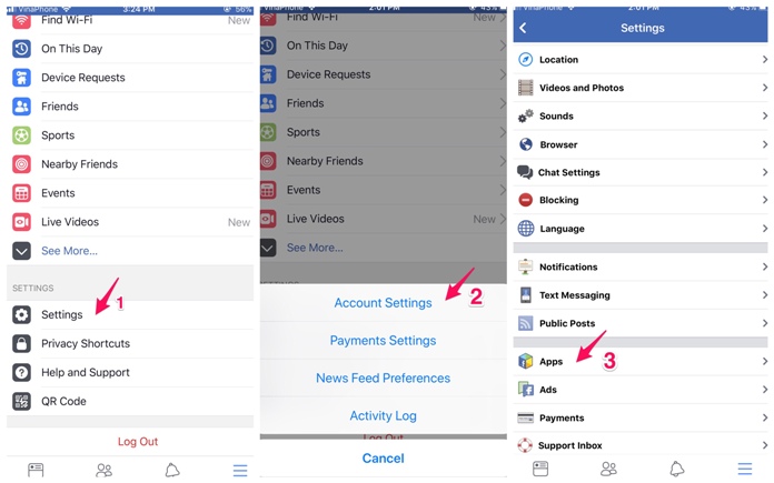 Bạn vào mục “Settings”/ “Account Settings”/ “Apps”.
