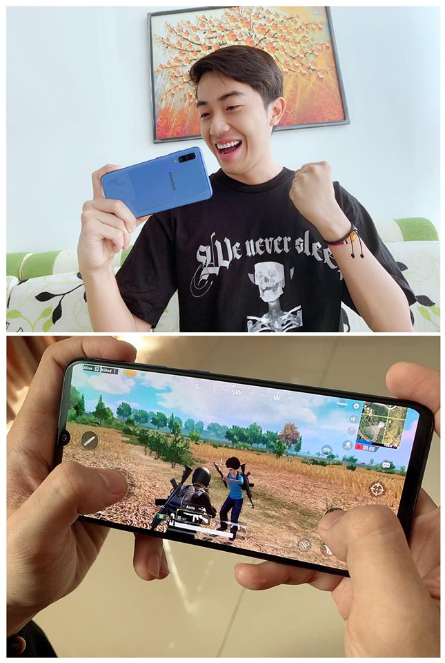 Cris Phan đề bạt chơi game trên Galaxy A70, bởi: “Điện thoại gì vừa to, vừa tràn, vừa dai. Màn hình đã vô cực, lại còn pin trâu. Nhấn mạnh là pin rất trâu nha, thắng rồi mà ‘nhây’ bắt chơi quài từ chiều đến tối, mong pin hết dùm để còn về cơm nước… mà sao vẫn dai”.