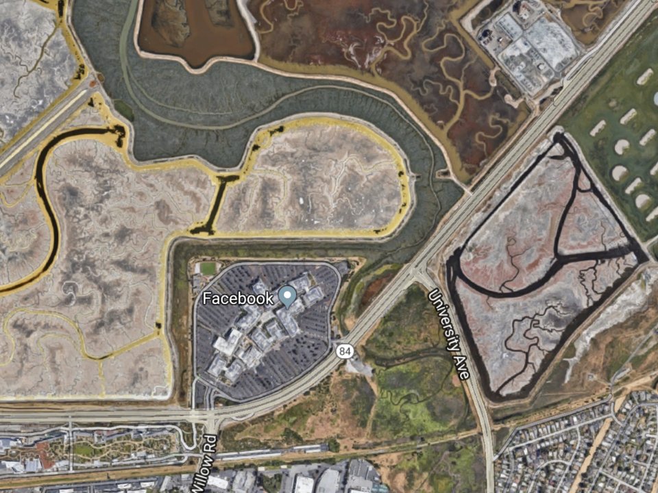 Cách đó khoảng 10 phút lái xe là trụ sở tương lai của Facebook. Hình ảnh chụp từ vệ tinh năm 1984 vùng Menlo Park, Califorina này về sau trở thành trụ sở của mạng xã hội lớn nhất hành tinh.