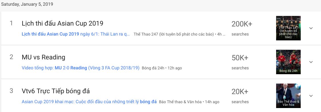 Theo đó, vào ngày 05/01, chủ đề tìm kiếm được nhắc đến nhiều nhất trên Google Việt Nam chính là “Lịch thi đấu Asian Cup 2019” với hơn 200 nghìn lượt tìm kiếm. Là công cụ tìm kiếm phổ biến nhất tại Việt Nam, những gì người dùng quan tâm trên Google có thể phần nào đó thể hiện khá chính xác mối quan tâm chung của người dùng Internet.