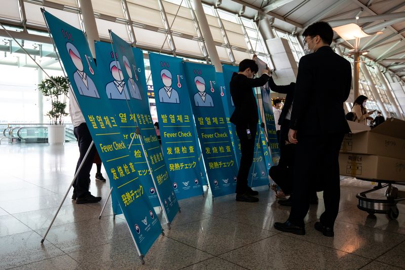 Thông báo kiểm tra thân nhiệt ở Sân bay Quốc tế Incheon, Hàn Quốc. (Ảnh: Bloomberg)