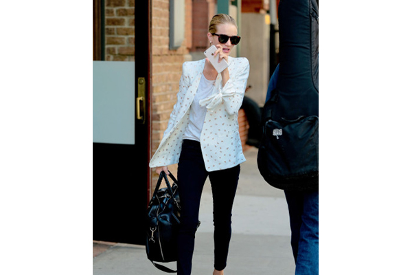 Người mẫu/ diễn viên Rosie Huntington-Whiteley dùng một chiếc iPhone để che mặt sau khi bước ra khỏi một khách sạn ở New York, Mỹ.