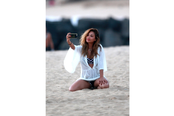 Nicole Scherzinger chụp ảnh tự sướng bằng iPhone trên một bãi biển khi đi nghỉ tại Oahu, HI năm 2015.