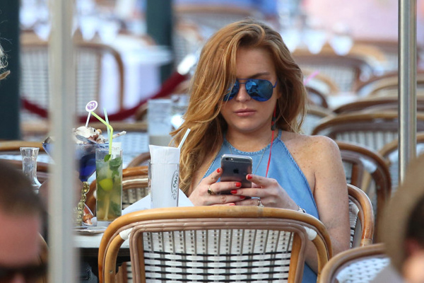 Linsay Lohan nhắn tin bằng iPhone khi đang thư giãn tại một quán cà phê có tên Café de Paris ở Monte Carlo ngày 17 tháng 6 năm 2015.