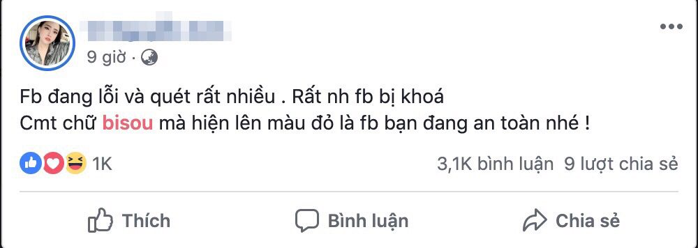 Cụ thể, bắt đầu từ sáng hôm nay (14/10), người dùng Facebook Việt Nam lại được dịp xôn xao với phương thức nhận biết tài khoản cá nhân của mình có an toàn hay không bằng việc nhập từ khoá “Bisou”. Chỉ cần lượn một vòng quanh Facebook, sẽ không khó để bắt gặp những bài đăng tương tự nhau với nội dung: “Facebook đang lỗi và càn quét (tài khoản) rất nhiều. Muốn kiểm tra Facebook có an toàn không thì commnet 'Bisou' nhé. Nếu hiện màu đỏ là Facebook bạn an toàn đấy ạ”.