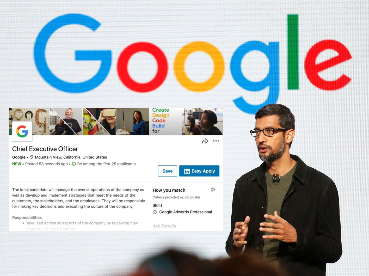 Bài đăng tuyển dụng giả liên quan đến vị trí CEO Google trên LinkedIn.