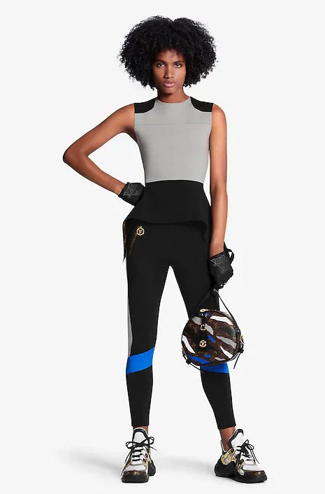 Bộ trang phục với áo peplum, quần legging, cộng với ví và giày sneaker, có giá 6.020 USD. (Ảnh: Louis Vuitton)