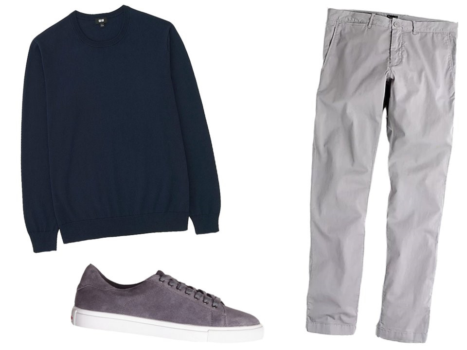 Quần chinos của C.rew giá 68 USD, Áo len Uniqlo dài tay 14,9 USD cùng giày Suede của brooksbrothers giá 78 USD.