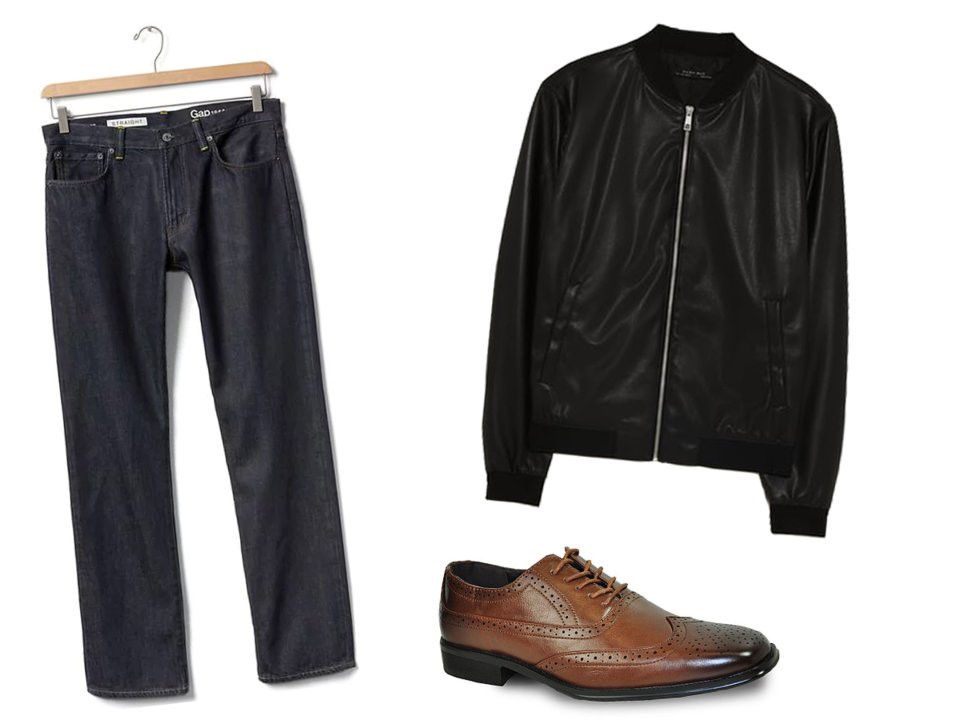 Áo khoác giả da Zara 89.9 USD, giày Bravo men's Milano-1 wing tip của Oxford giá 35 USD và quần jean Gap 36 USD.