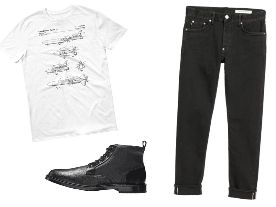 Áo phông họa tiết tàu vũ trụ 23 USD, quần jean H&M 60 USD và giày Cole Haan Adams Grand demiboot có giá 90 USD.