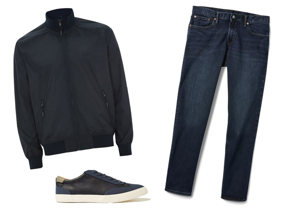 Áo Topman navy track jacket 75 USD, giày Topman Navy PU Swiss retro 55 USD và quần jean Gap 56 USD. Tổng cộng 186 USD.