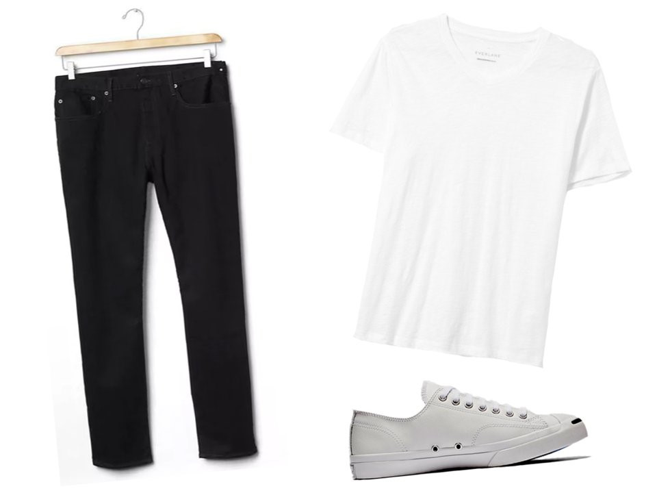 Quần jean Gap 50 USD, áo thun trắng cổ hình chữ V của everlane 22 USD và giày Converse 70 USD. Tổng cộng 142 USD.