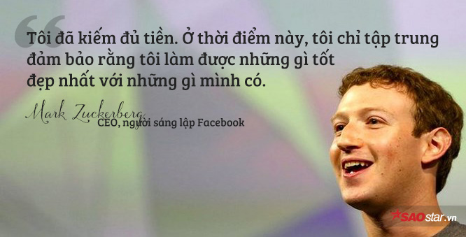 “Tôi đã kiếm đủ tiền. Ở thời điểm này, tôi chỉ tập trung đảm bảo rằng tôi làm được những gì tốt đẹp nhất với những gì mình có. Cách chính tôi có thể giúp đỡ là thông qua Facebook - mang đến cho mọi người quyền được chia sẻ và kết nối với thế giới,” Mark Zuckerberg chia sẻ. “Tôi cũng tập trung vào các công việc thiện nguyện liên quan đến giáo dục và sức khoẻ của mình bên ngoài Facebook. Quá nhiều người đã qua đời một cách không đáng và họ không nhận được những cơ hội mình đáng được nhận. Có rất nhiều thứ trên thế giới cần được sửa chữa và tôi may mắn có cơ hội được làm việc để sửa chữa một số trong đó.”
