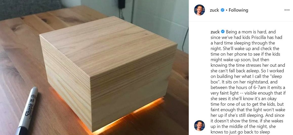 Mark Zuckerberg mới đây chia sẻ anh đã phát triển thành công một hộp gỗ phát sáng có thể giúp vợ anh Priscilla ngủ ngon hơn mỗi đêm mà không phải kiểm tra điện thoại xem đã đến giờ phải kiểm tra lũ trẻ chưa.