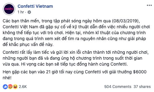 Cụ thể, Confetti Vietnam thừa nhận trong tập phát sóng ngày 8/3, Confetti Vietnam đã gặp phải sự cố về mặt kĩ thuật khiến nhiều người chơi không thể tiếp tục với trò chơi. Dù vậy, phía Confetti Vietnam cho biết đến thời điểm hiện tại nhóm kĩ thuật của chương trình vẫn đang trong quá trình xem xét để tìm ra nguyên nhân cũng như giải pháp để khắc phục vấn đề này. Game đố vui có thưởng của Facebook gửi lời xin lỗi đến người chơi. Lỗi kĩ thuật trong số phát sóng của Confetti Vietnam khiến không ít người chơi cảm thấy bức xúc.