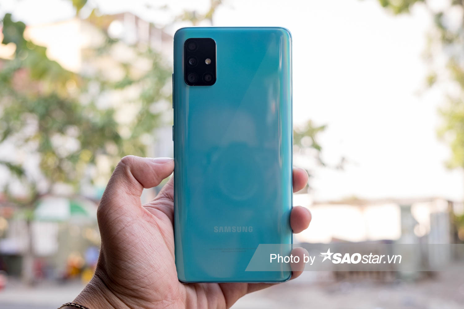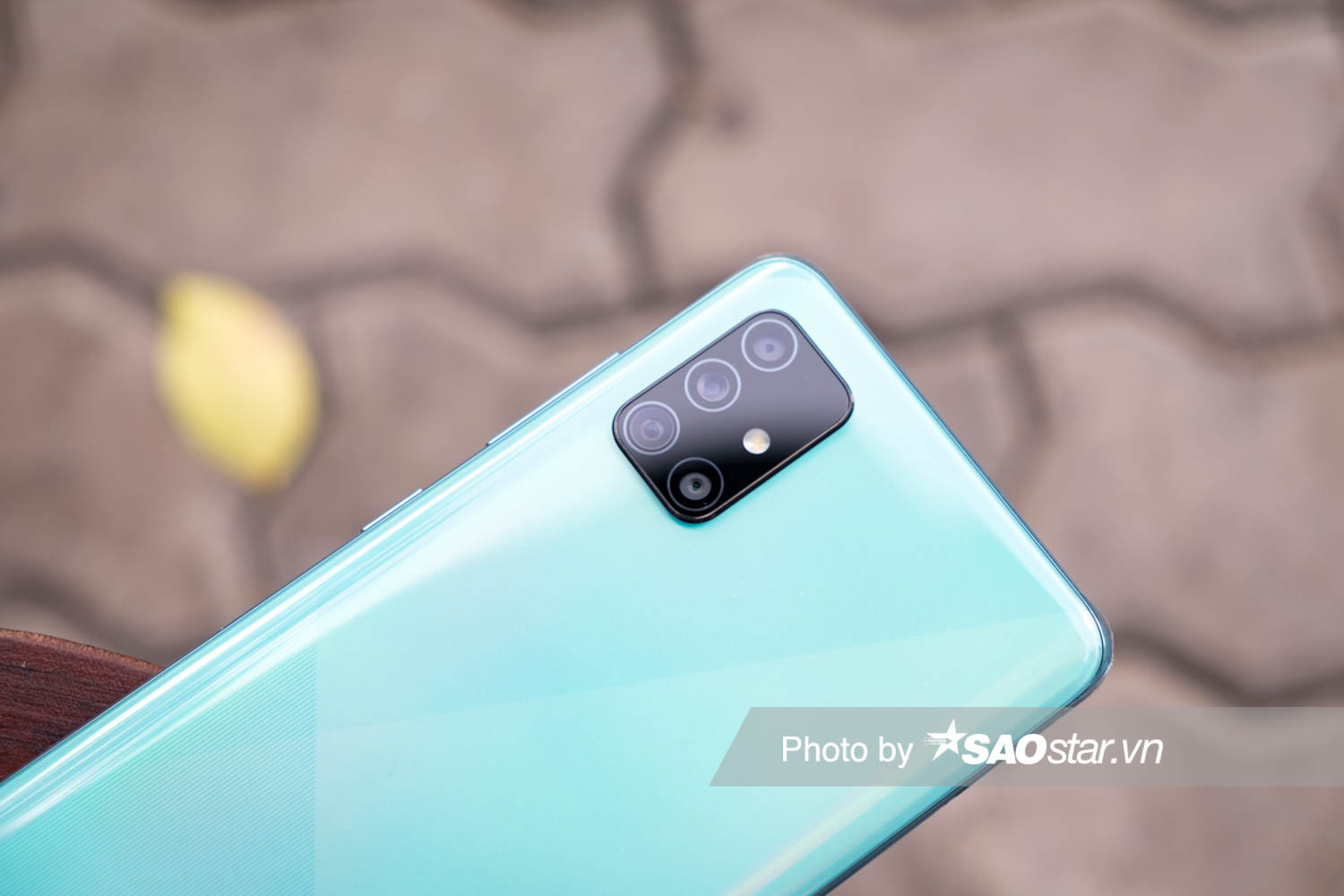 Bên cạnh màu sắc bắt mắt, mặt lưng của Galaxy A51 của Samsung còn gây ấn tượng nhờ trang bị hệ thống camera sau có 4 ống kính được sắp xếp thành hình chữ L và đặt trong một module hình chữ nhật khá lớn.