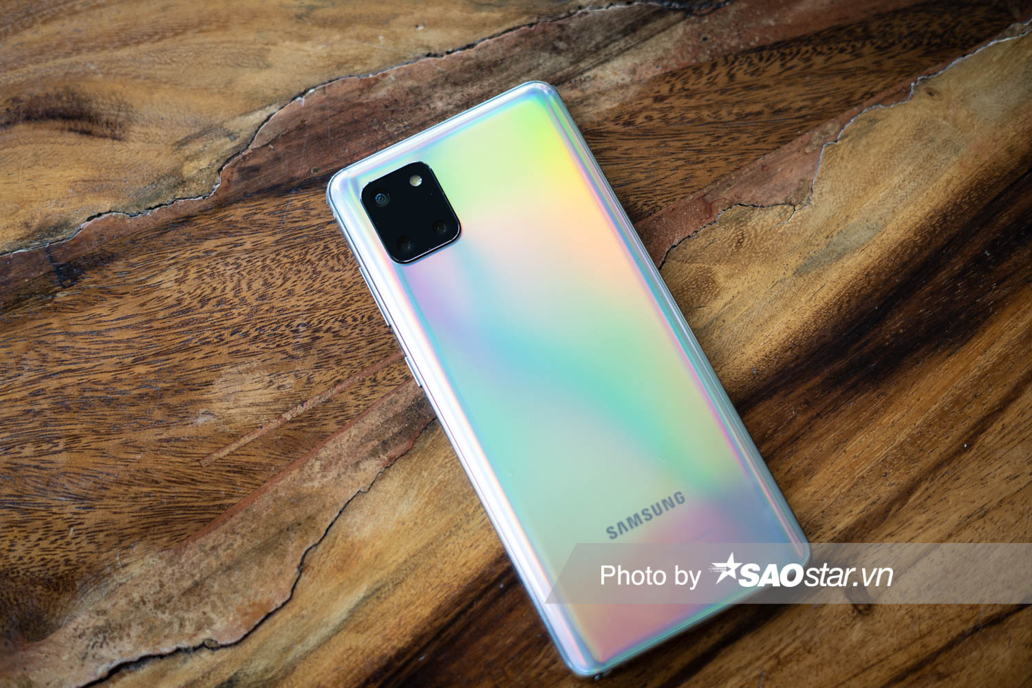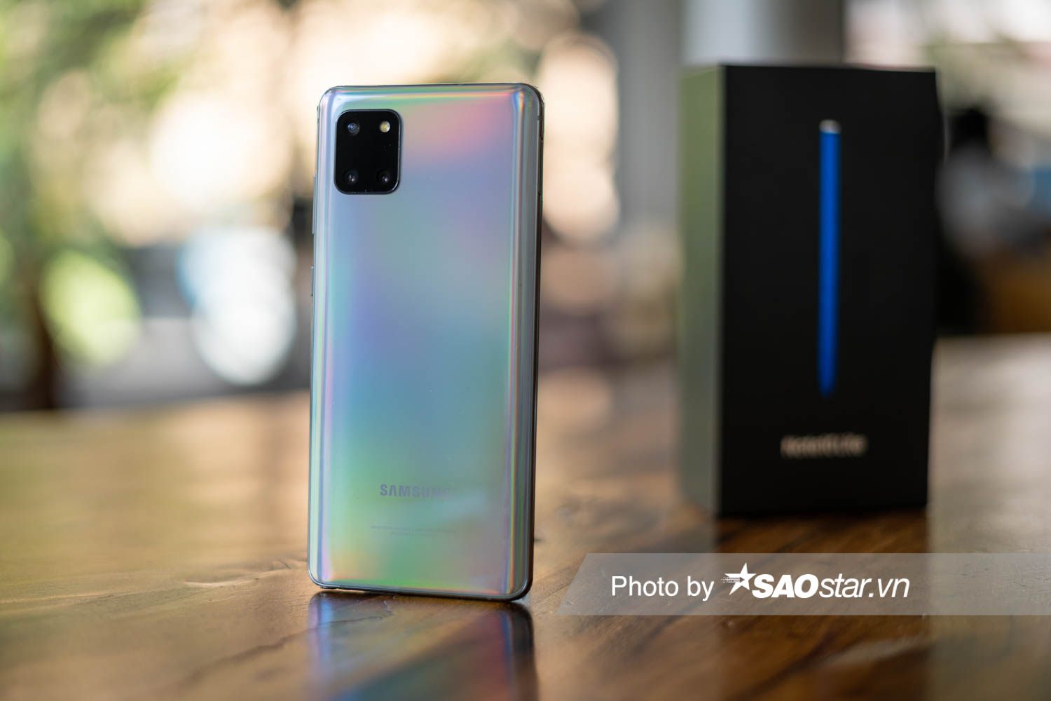 Galaxy Note10 Lite bán ra tại Việt Nam có 2 bản màu là Ánh cực quang cùng màu Đen pha lê. Trong ảnh là phiên bản Ánh cực quang với màu sắc thay đổi liên tục khi người dùng di chuyển thiết bị sang nhiều góc độ khác nhau.